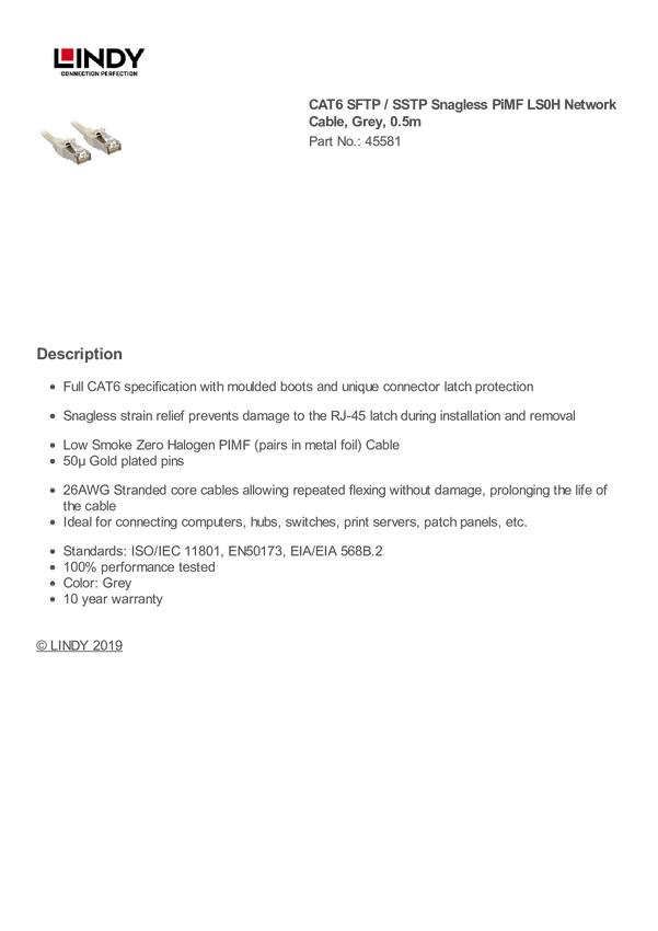 kabel LAN LINDY 45585, 1 szt., RJ45, CAT 6, S/FTP, 5.00 m, szary