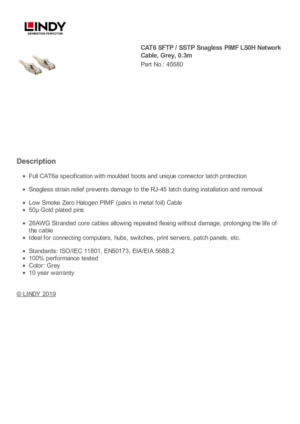 kabel LAN LINDY 45580, 1 szt., RJ45, CAT 6, S/FTP, 0.30 m, szary