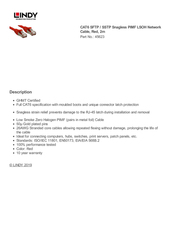 kabel LAN LINDY 45623, 1 szt., RJ45, CAT 6, S/STP, 2.00 m, czerwony