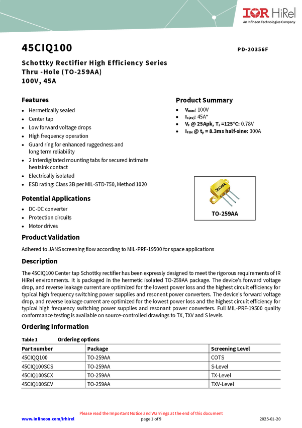 IR HiRel's 45CIQ100SCS is a 45A 100V common cathode configuration Schottky diode in a TO-259AA package. Optimized for the lowest power loss and highest circuit efficiency in high frequency switching power supplies and resonant power converters, along with JANS level screening make this device reliable for space applications and other harsh environments.