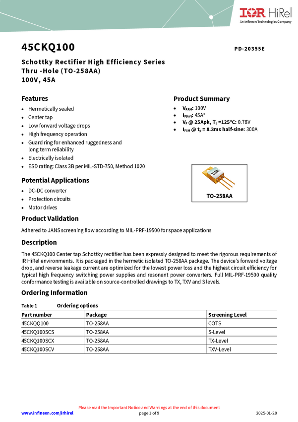 IR HiRel's 45CKQ100SCX is a 45A 100V common cathode configuration Schottky diode in a TO-258AA package. Optimized for the lowest power loss and highest circuit efficiency in high frequency switching power supplies and resonant power converters, along with JANTX level screening make this device reliable for space applications and other harsh environments.
