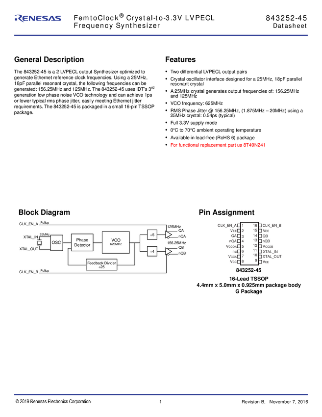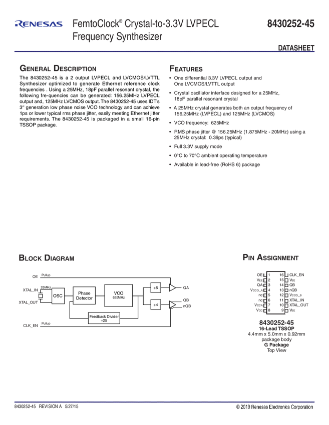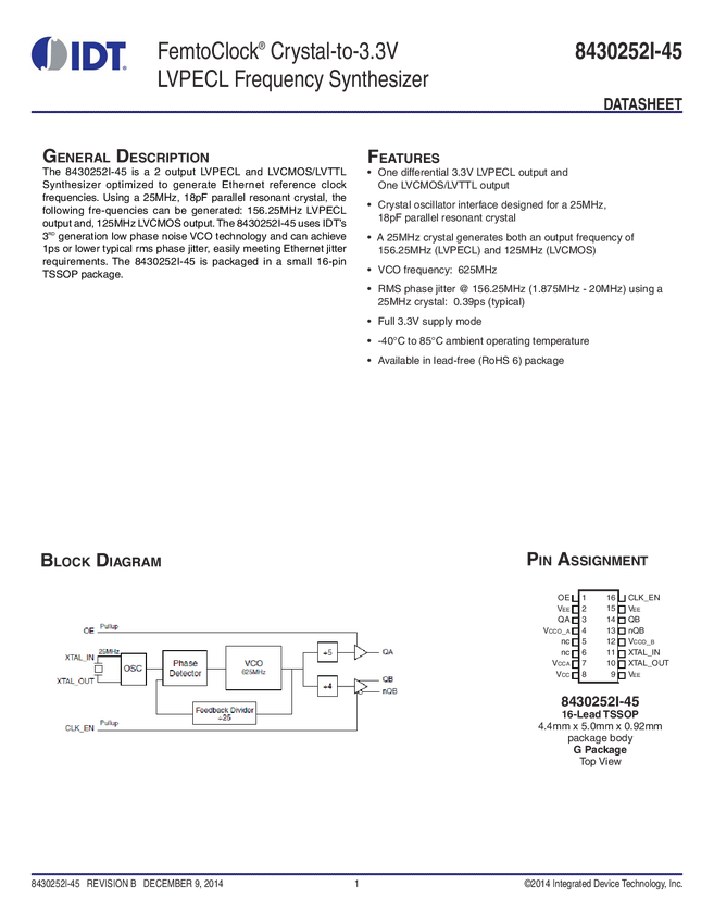 FemtoClock Crystal-to-3.3V LVPECL Frequency Synthesizer