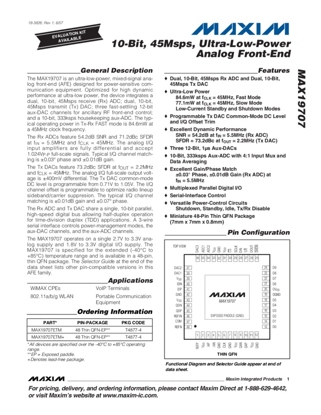 MAX19707 10-Bit, 45Msps, Ultra-Low-Power Analog Front-End