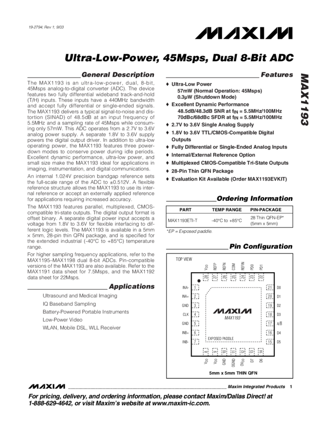 MAX1193 Ultra-Low Power, 45Msps, Dual 8-Bit ADC