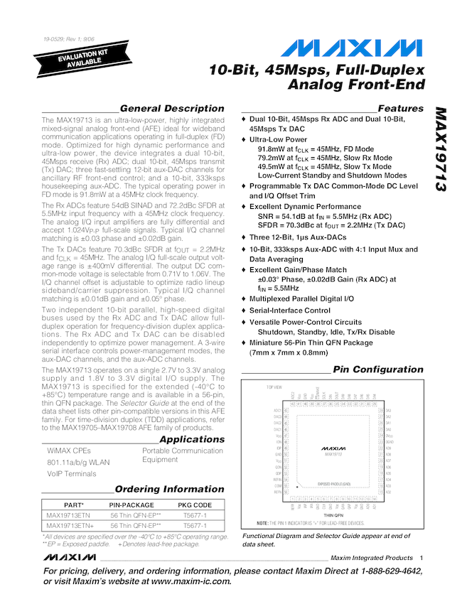 MAX19713 10-Bit, 45Msps, Full-Duplex Analog Front-End