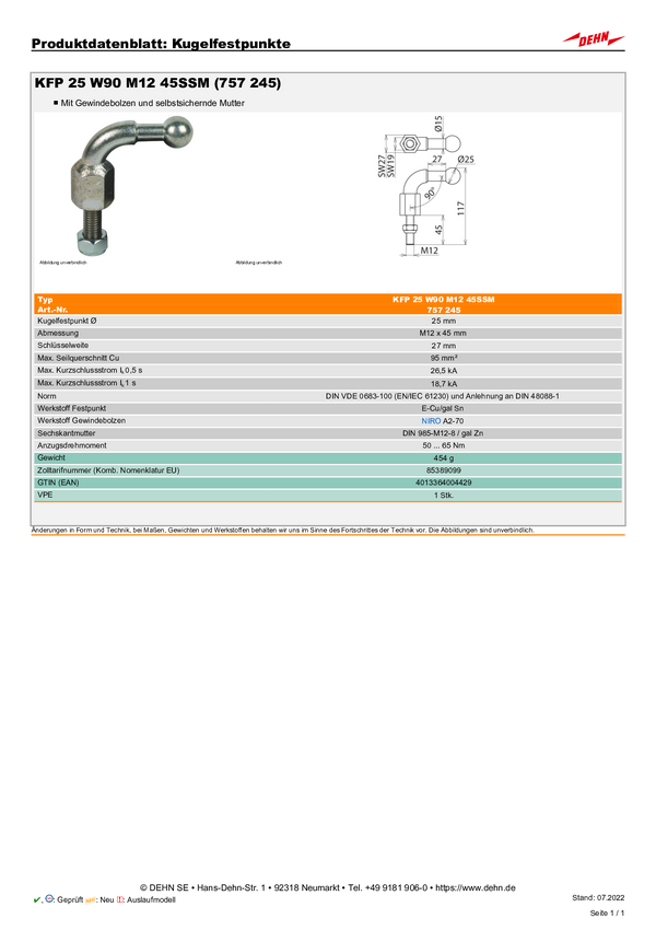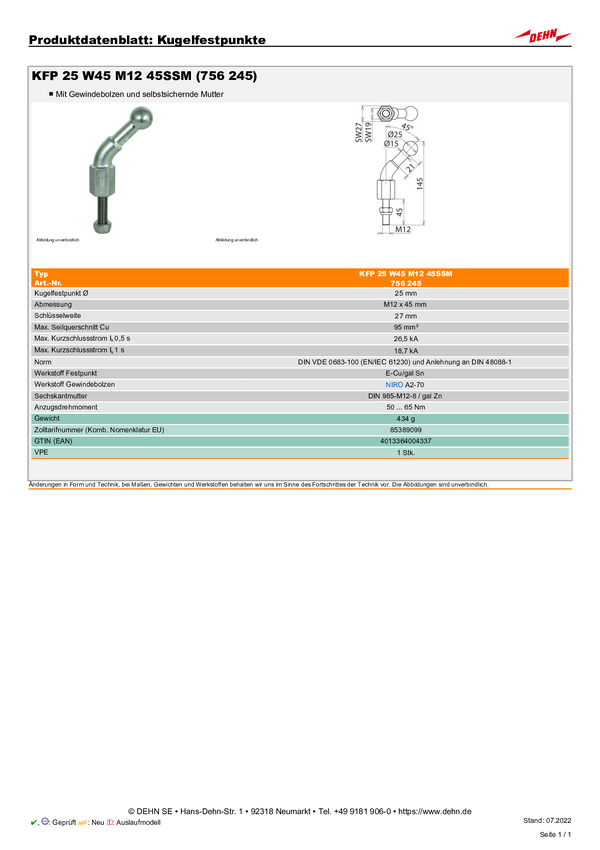 DEHN 757245 KFP 25 W90 M12 45SSM Sferyczny punkt stały 1 szt.