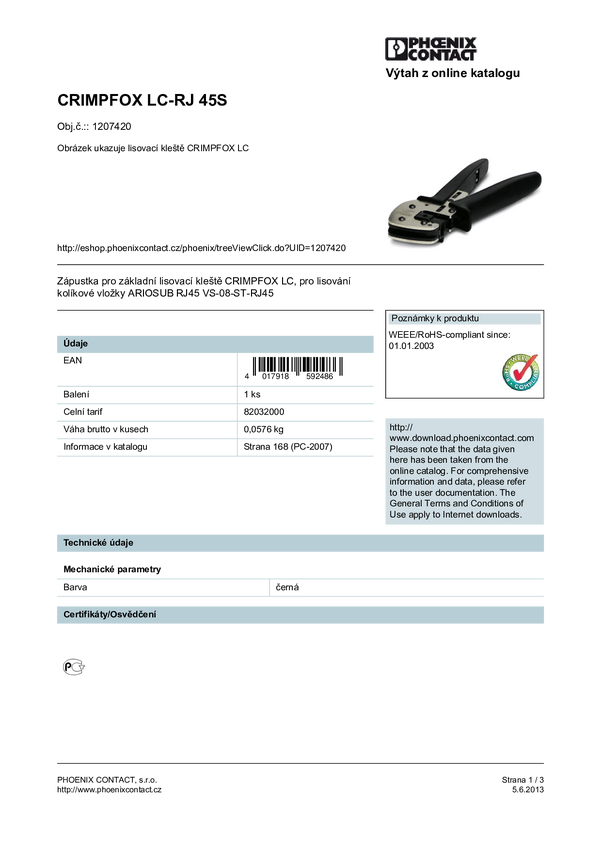Phoenix Contact CRIMPFOX LC-RJ 45S 1207420 Matryca do zaciskarki Variosub Kompatybilność wkładki pinowe VS-08-ST-RJ45 RJ