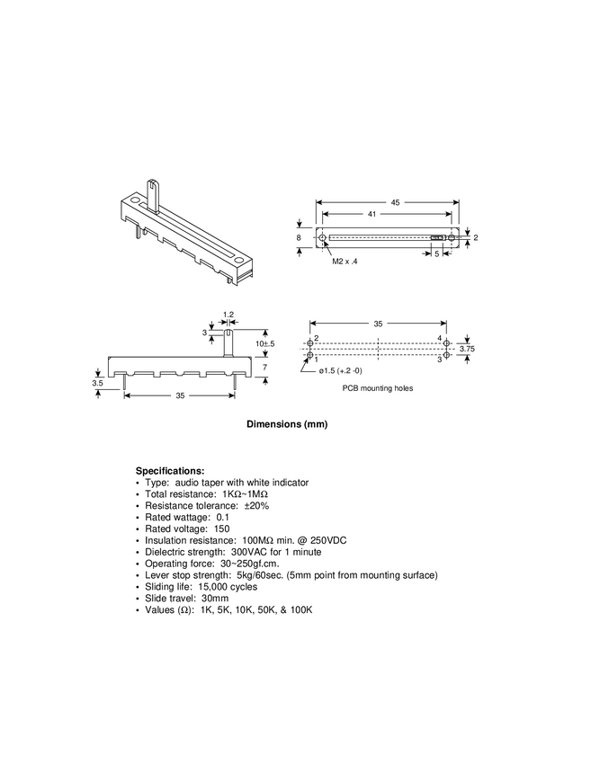Potencjometr suwakowy travel 30mm; wym:45x8x7mm śr.41mm Rozstaw pinów 3,75mm;35mm; wodzik plastyk wys.10.5mmx5mmx2mm trwałość 15.000 cykli; moc 0,1W; tylko mono Audio (log) 5k,10k,50k,100k, wodzik plastyk