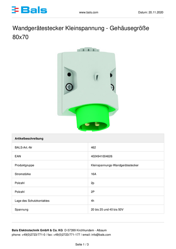 Złącze męskie ścienne CEE Bals Elektrotechnik 462 16.0 A 50 V