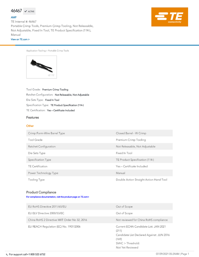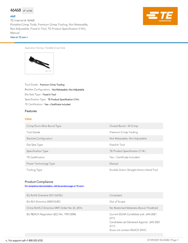 TE Connectivity TE AMP Certi-Crimp Hand Tools 46468