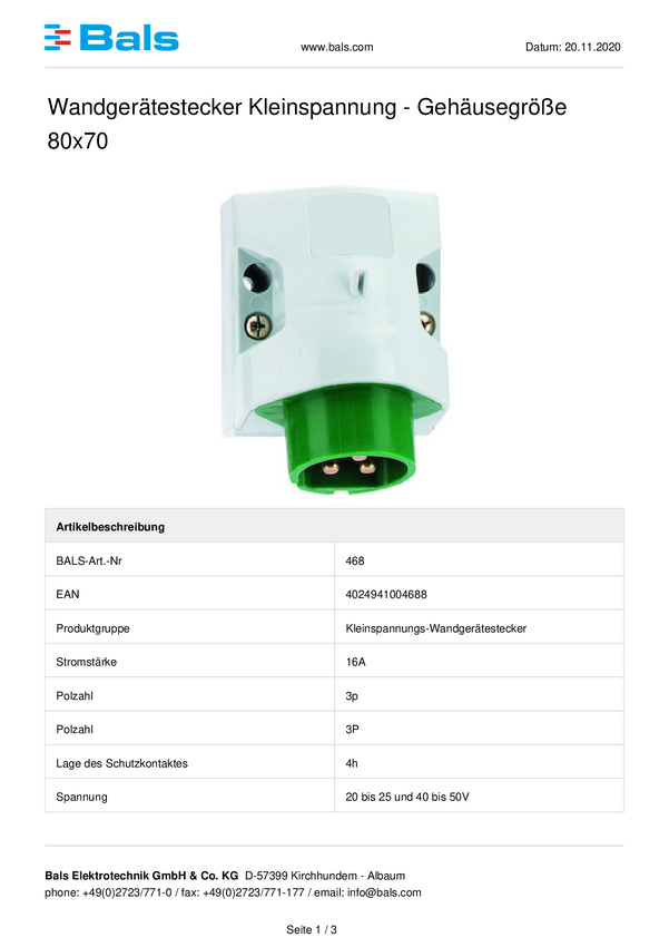 Złacze męskie CEE Bals Elektrotechnik 468 16.0 A 50 V