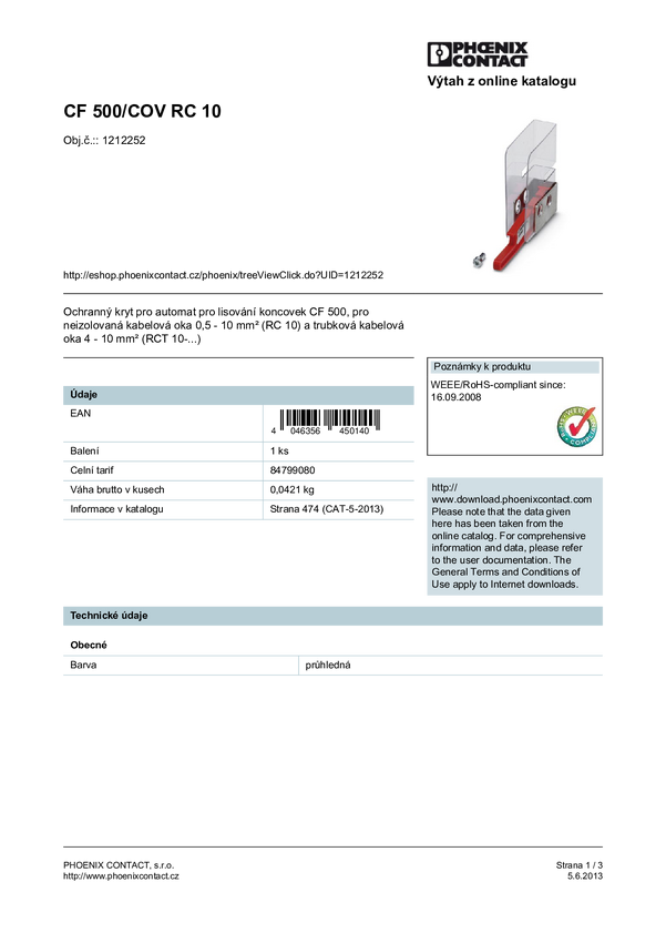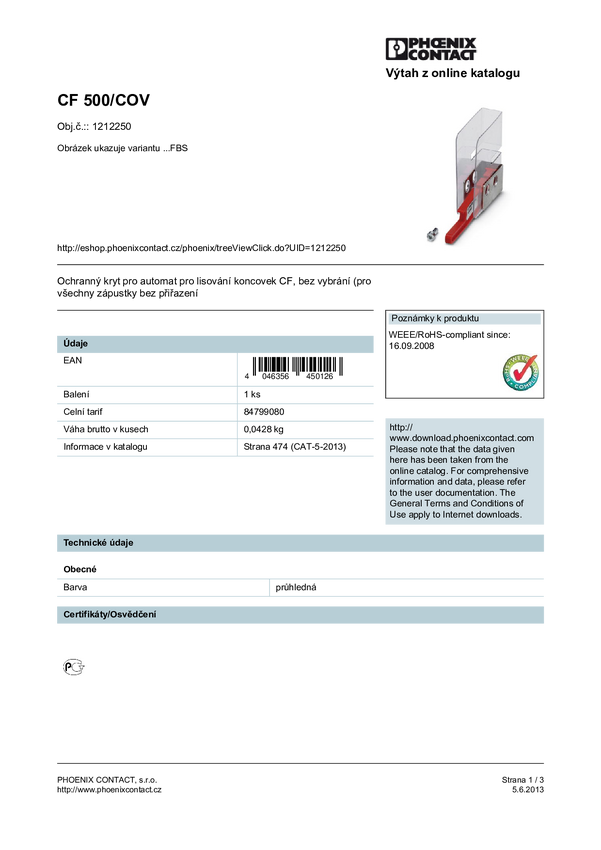 Phoenix Contact CF 500/COV RCT 2,5 1212253 Osłona zabezpieczająca Kompatybilność z markami Phoenix Contact 467893, 46988