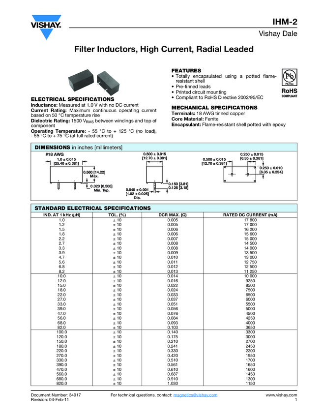 Ind Filter 470uH 10% 1KHz Ferrite 1.6A RDL Bulk