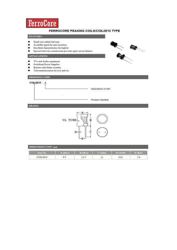 Dławik; drutowy; 470uH; 500mA; 1,94R; 10%; R=3mm; THT; FERROCORE; COIL0608-0.47; RoHS; op/100szt