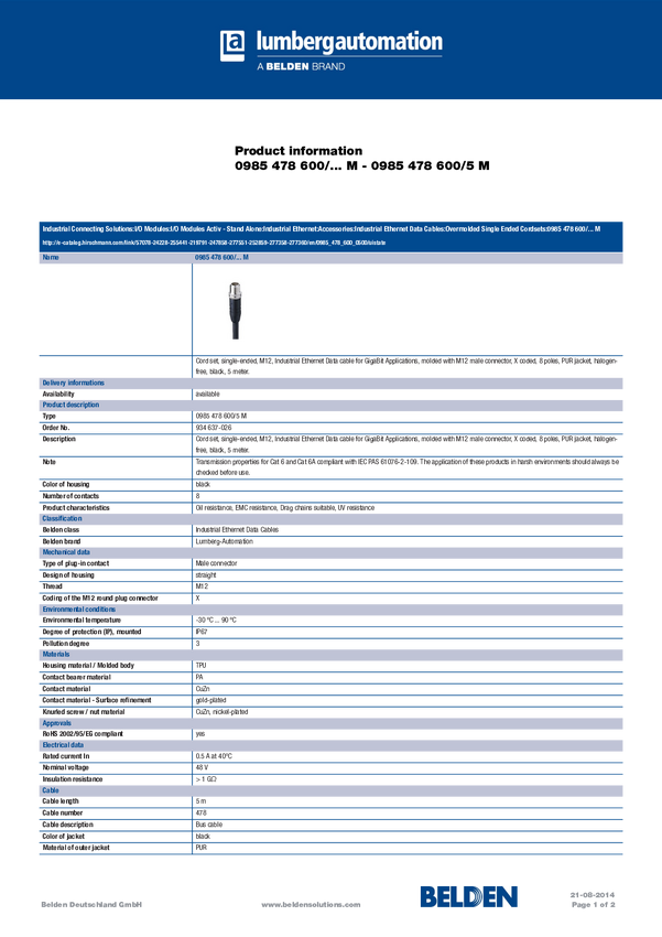 Przewód połączeniowy Belden 0985 478 600/5M 934637026 5 szt.