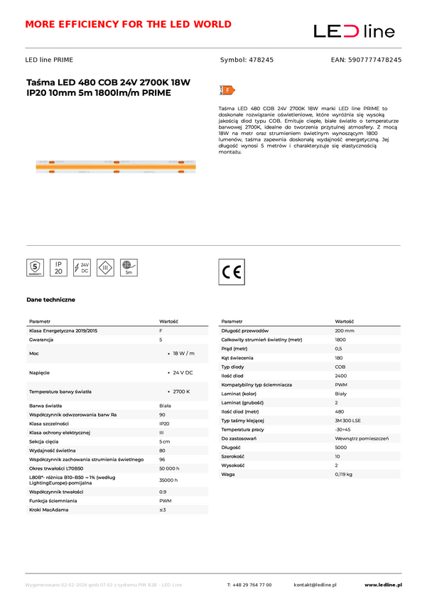 Taśma LED COB chips; 2400 led; biały ciepły; 2700K; 180*; 9000lm; 18W/m; 24V; 90W; 480LED/m; IP20; rolka 5m; 478245; LEDIN; RoHS