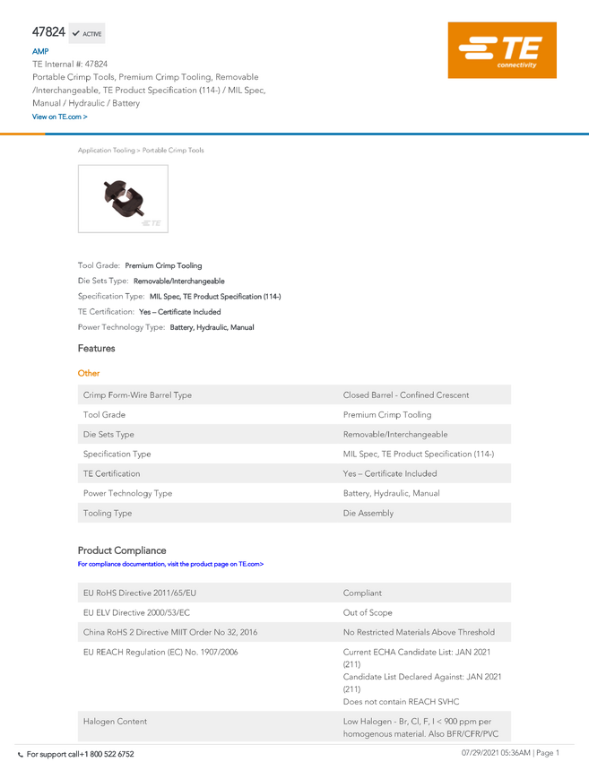 TE Connectivity TE AMP Powered Crimp Tools 47824