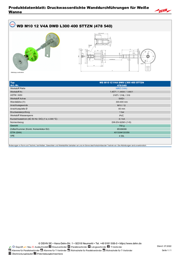 DEHN 478540 WD M10 12 V4A DWD L300 400 STTZN Tuleja ścienna 1 szt.