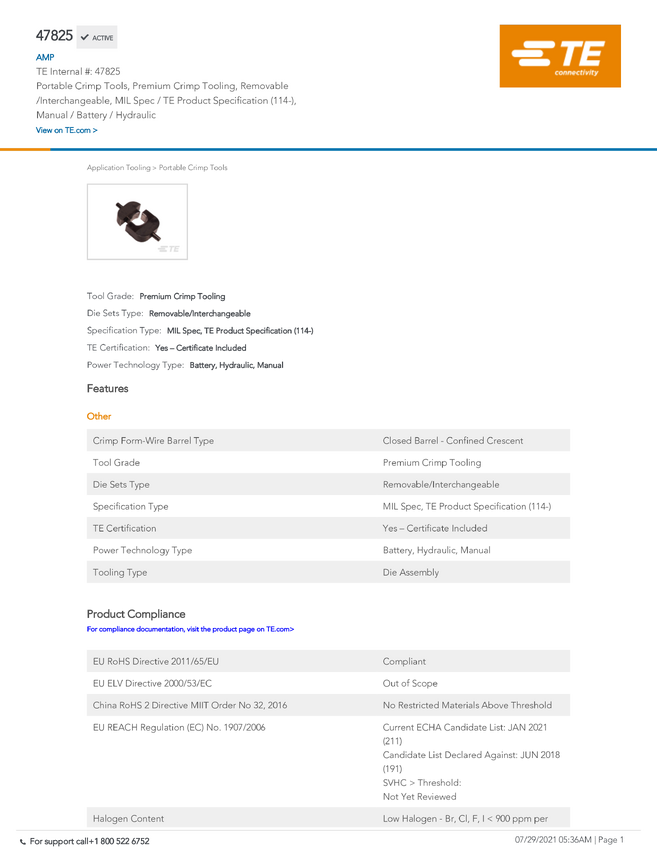TE Connectivity TE AMP Powered Crimp Tools 47825