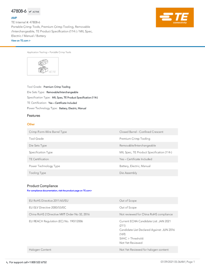 TE Connectivity TE AMP Certi-Crimp Hand Tools 47808-6