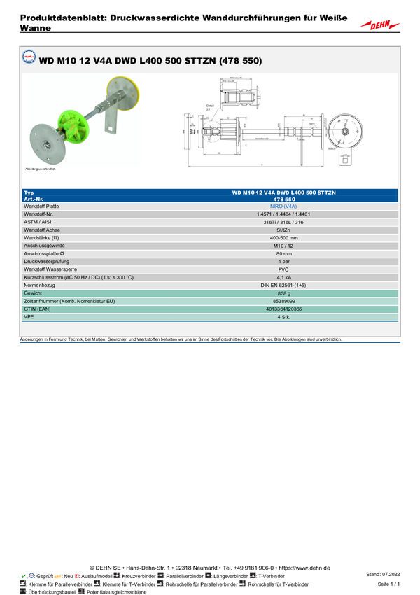 DEHN 478550 WD M10 12 V4A DWD L400 500 STTZN Tuleja ścienna 1 szt.