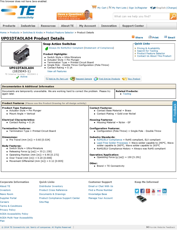 Switch Snap Action N.O./N.C. SPDT Pin Plunger Solder 0.1A 30VDC 1.47N Screw Mount