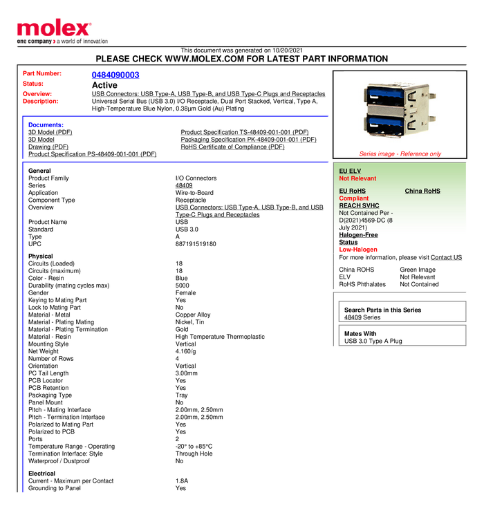Molex 484090003 Złącze męskie USB, 1 szt.