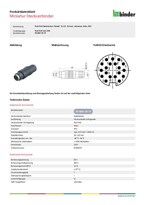 binder 99 4841 00 19-20 Złącze męskie kablowe złącze męskie proste Seria: 440 Łączna ilość styków: 19 1 szt.