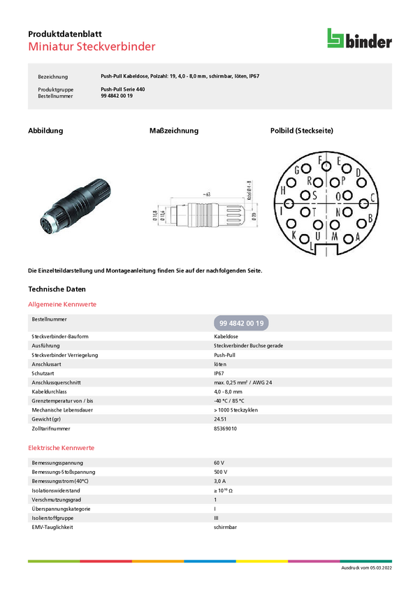 binder 99 4842 00 19-20 Złącze żeńskie kablowe złącze żeńskie proste Seria: 440 Łączna ilość styków: 19 1 szt.
