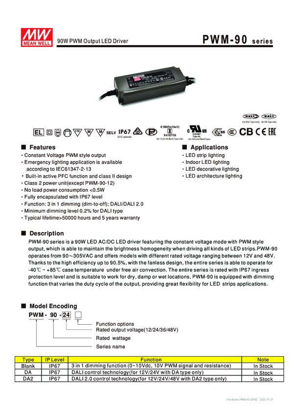 Zasilacz z interfejsem DALI2 do oświetlenia LED 48V 4,17A 200W Mean Well PWM-200-48DA2