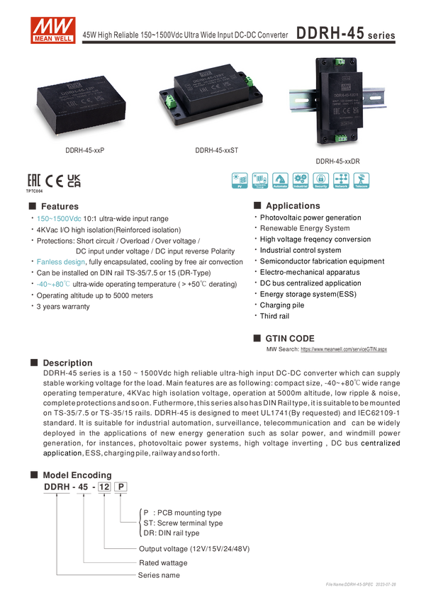 Przetwornica DC/DC, do PCB MW Mean Well DDRH-45-48P DDRH-45-48P 48 V/DC Ilość wyjść:1 x