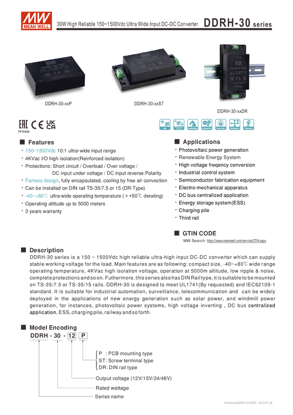 Przetwornica DC/DC, do PCB MW Mean Well DDRH-30-48P DDRH-30-48P 48 V/DC Ilość wyjść:1 x
