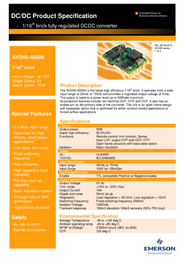 Module DC-DC 1-OUT 5V 10A 50W 8-Pin 1/16-Brick