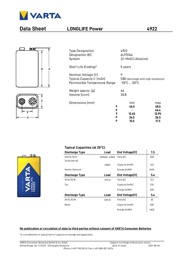 Bateria 9 V Varta LONGLIFE Power 9V Bli 1, alkaliczno-manganowe, 1 szt.