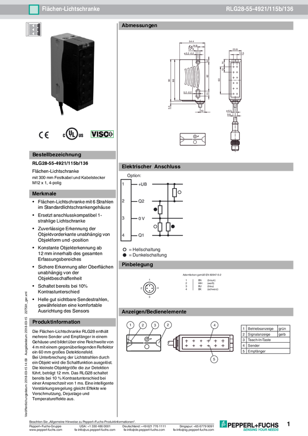 Czujnik fotoelektryczny Pepperl+Fuchs RLG28-55-4921/115b/136 227581 Polaryzator, przełączanie w ciemności, przełączanie