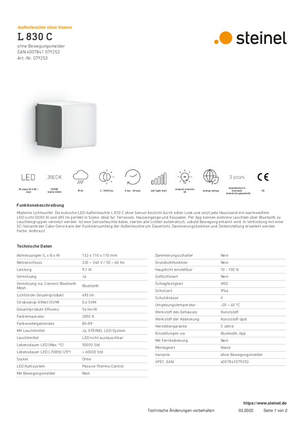 Zewnętrzna lampa ścienna Steinel LED AUSSENLEUCHTE L 830 C ANT 079253 9.1 W 493 lm IP44