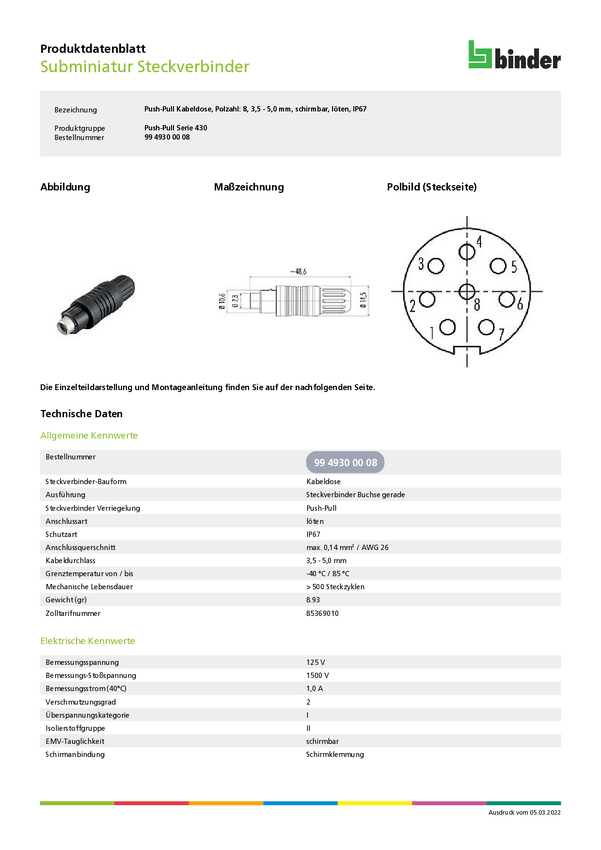 binder 99 4930 00 08-20 Złącze żeńskie kablowe złącze żeńskie proste Seria: 430 Łączna ilość styków: 8 1 szt.