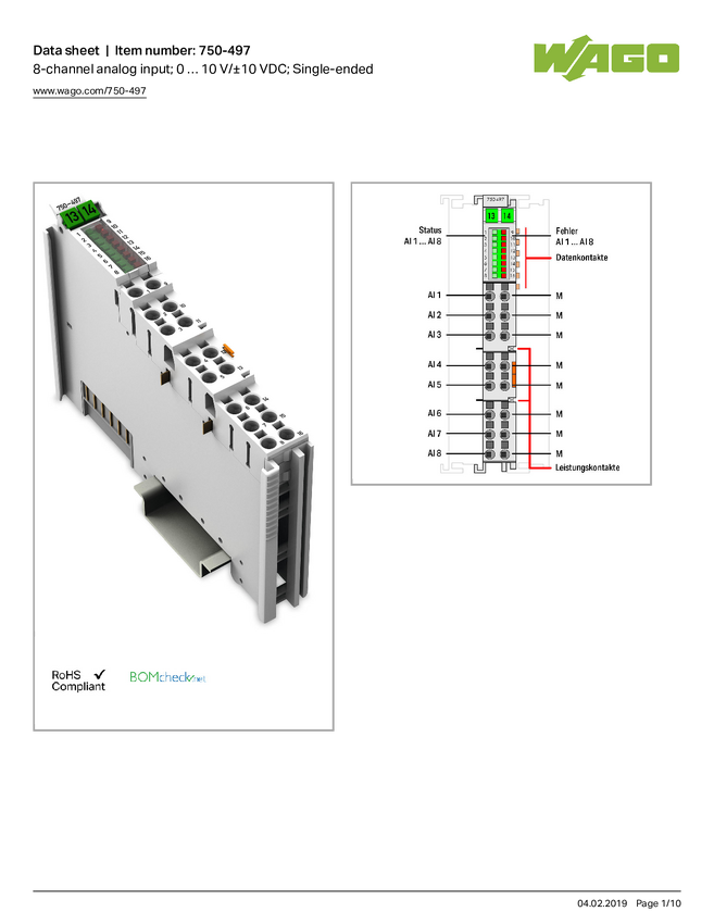 WAGO 750-497 Moduł wejścia anologowego PLC 1 szt.