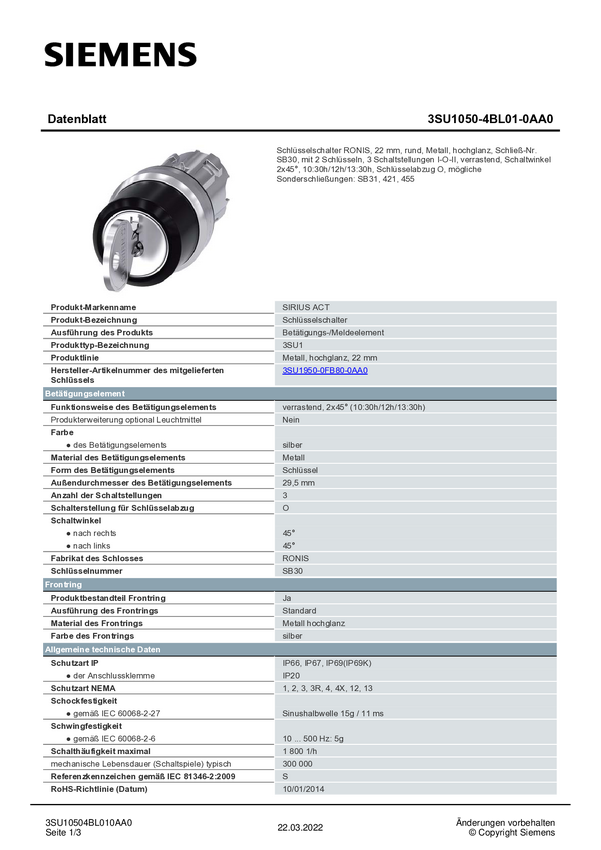 Siemens 3SU10504BL010AA0 3SU1050-4BL01-0AA0 Przełącznik kluczykowy 2 x 45 ° IP66, IP67, IP69/IP69K 1 szt.