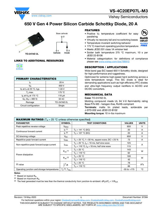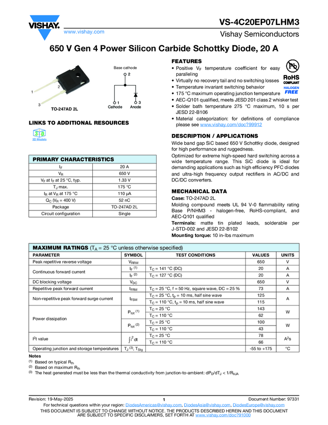 650 V Gen 4 Power Silicon Carbide Schottky Diode, 20 A
