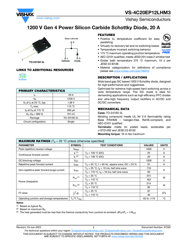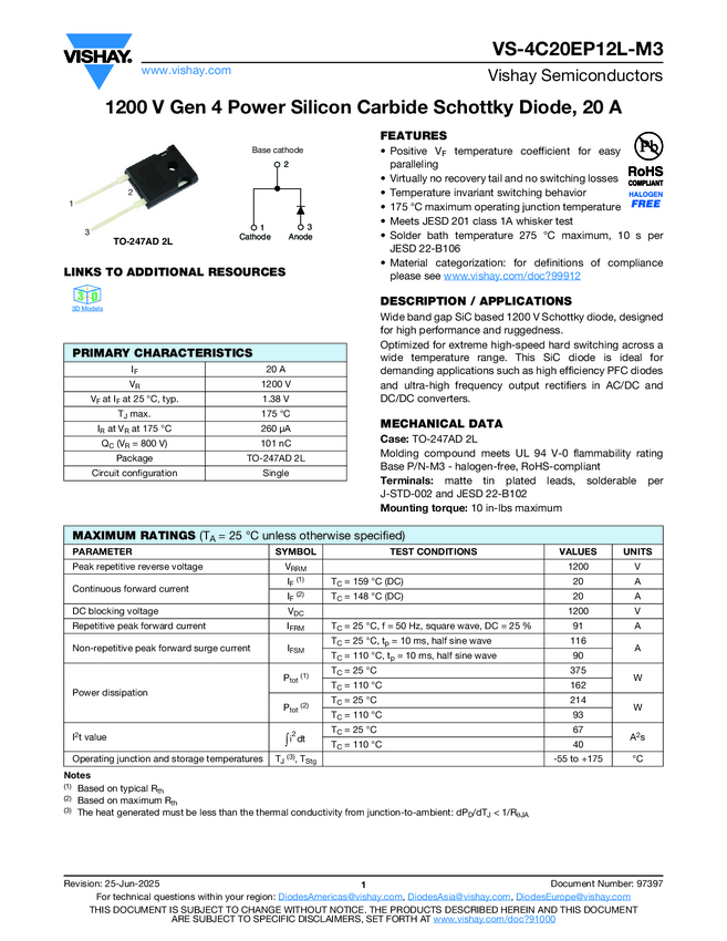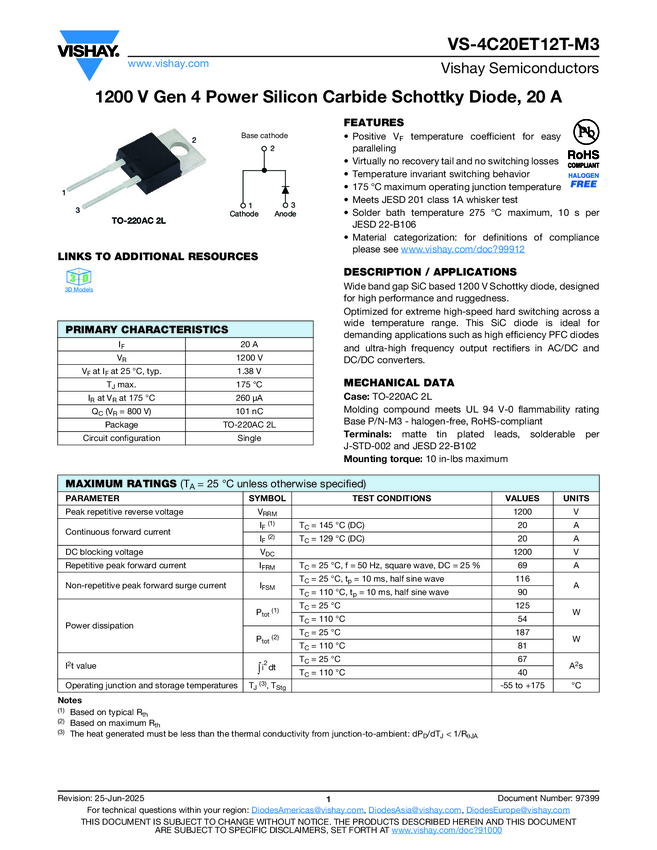 1200 V Gen 4 Power Silicon Carbide Schottky Diode, 20 A