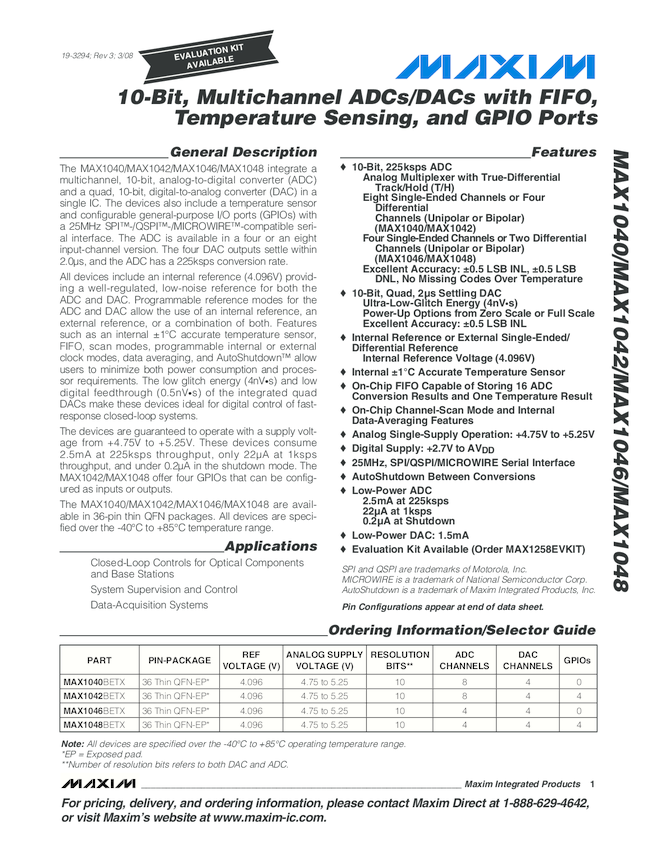 MAX1048 10-bit Codec with 4CH ADC, 4CH DAC, 4 GPIO