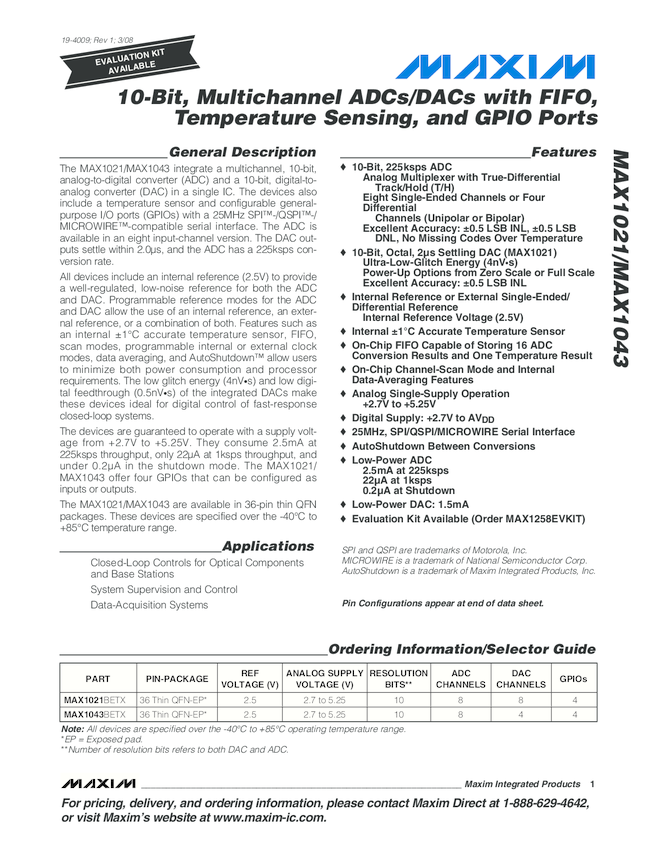 MAX1043 10-bit Codec with 8CH ADC, 4CH DAC, 4 GPIO