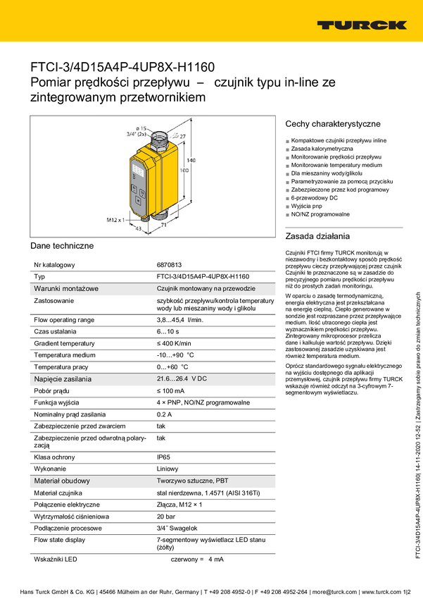 Turck 6870813 Czujnik liniowy FTCI-3/4D15A4P-4UP8X-H1160, 21.6 - 26.4 V/DC, 1 szt.