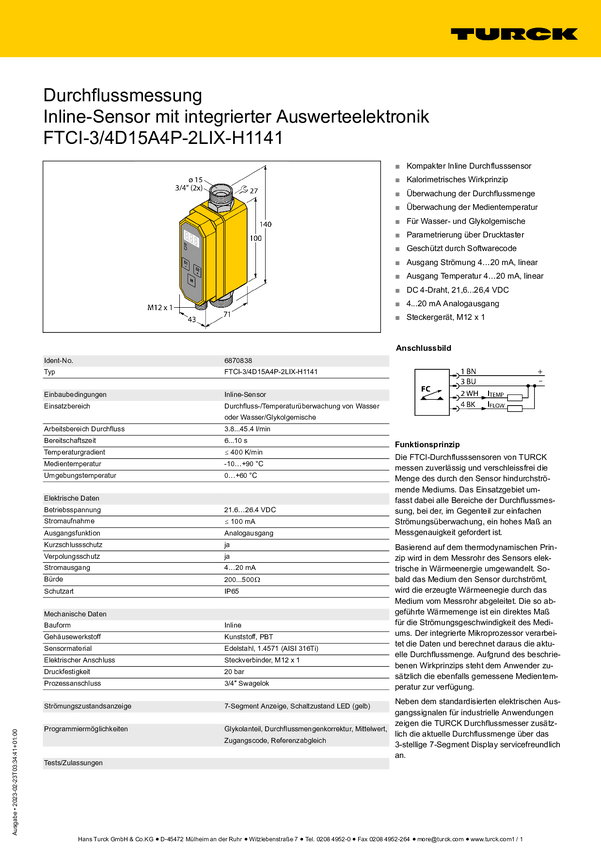 Turck 6870811 Czujnik liniowy FTCI-3/4D15A4P-LI-UP8X-H1141, 21.6 - 26.4 V/DC, 1 szt.