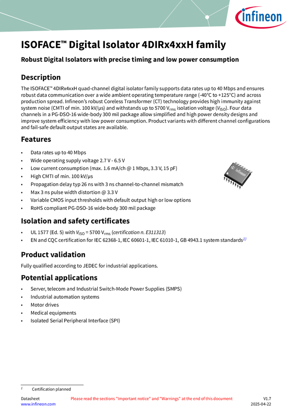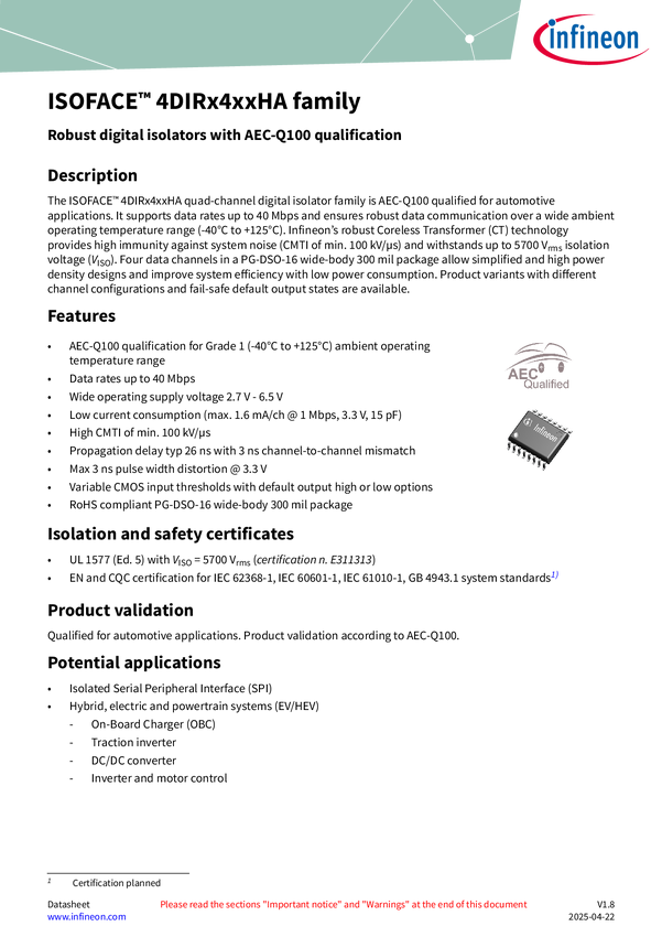 Quad-channel digital isolator 4DIR1421HA in DSO-16 wide-body package The 4DIR1421HA (with 3 forward channels) is AEC-Q100 qualified and provides robust reinforced isolation for high-voltage automotive applications. Four data channels allow for simplified and high-power density designs and improve system efficiency with low power consumption. With a wide supply voltage range, active-low output enable, and default high output state, it is a perfect fit for SPI communication interface where reinforced isolati