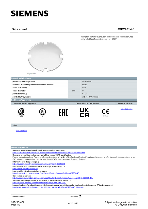 Tablica opisowa Siemens 3SB2901-4EL 10 szt.