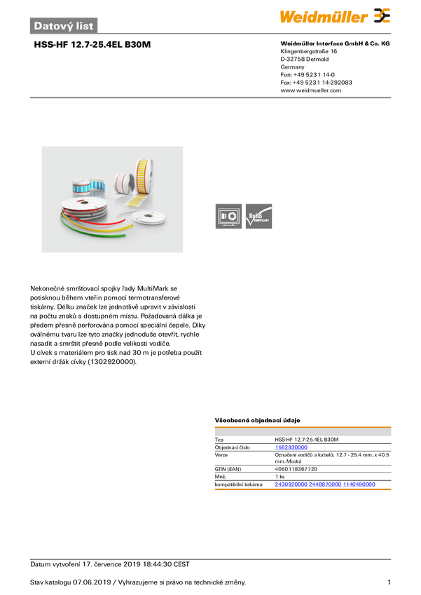 Weidmüller 1562930000 HSS-HF 12.7-25.4EL B30M System znakowania kabli niebieski 1 szt.