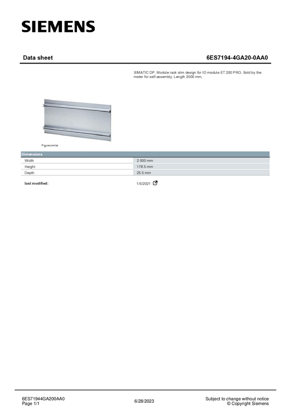 Uchwyt szyny nośnej Siemens 6ES7194-4GA20-0AA0 2000 mm 1 szt.