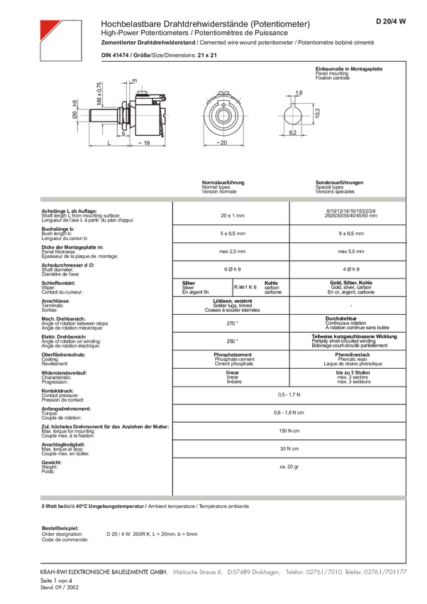 KRAH D 20/4W 10% 4K7 D 20/4W 10% 4K7 Potencjometr drutowy 4 W 4.7 kΩ 1 szt.